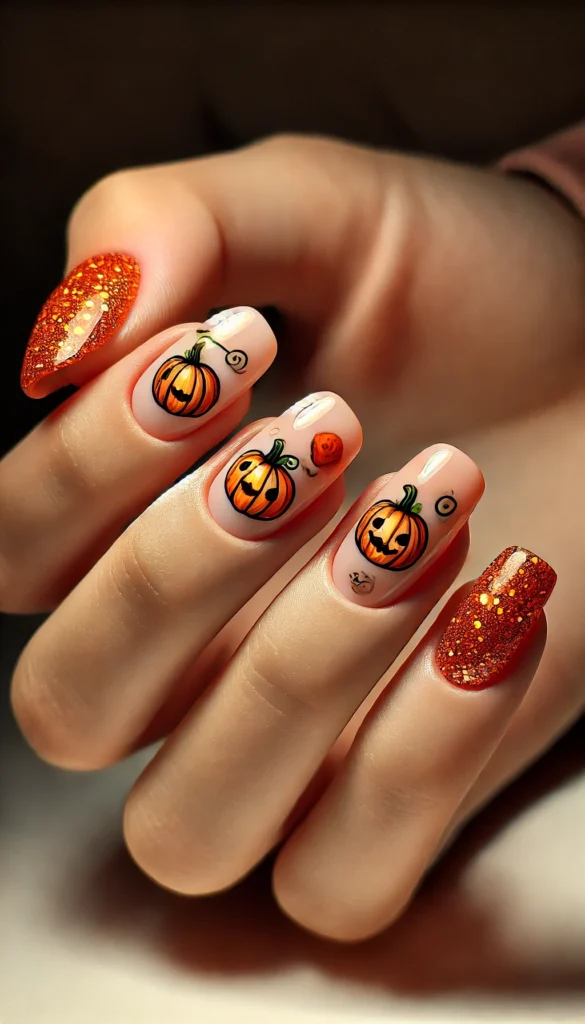 Tiny orange pumpkins on a soft neutral base with a glitter accent nail give your nails a sweet and festive look.