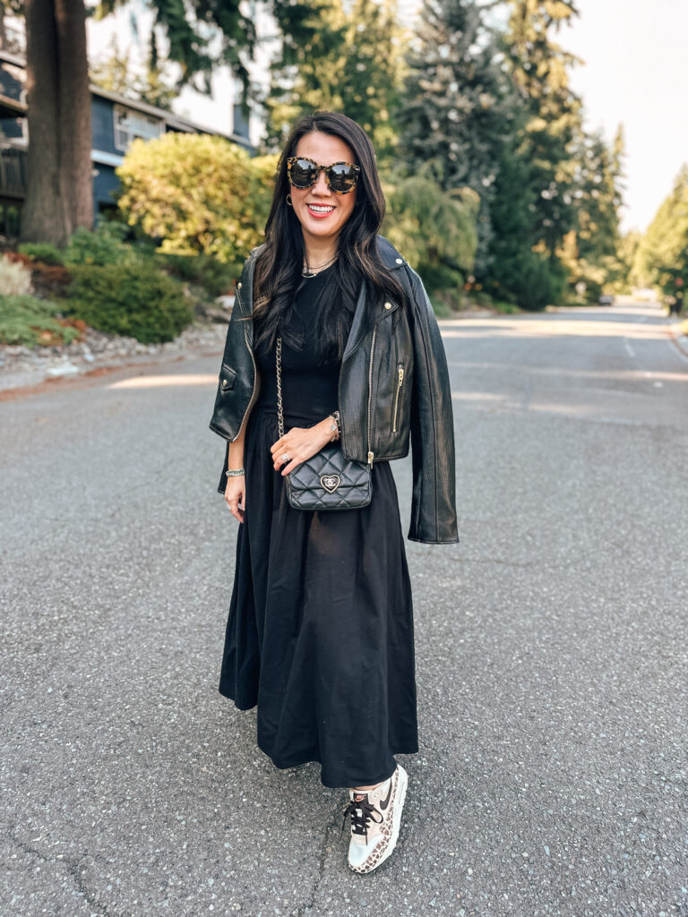 This look is chic and comfy. The black maxi dress with the full skirt is great for anytime of the year. Top it off with a black moto jacket and some cute sneakers, you’ll be set for fall into winter!
