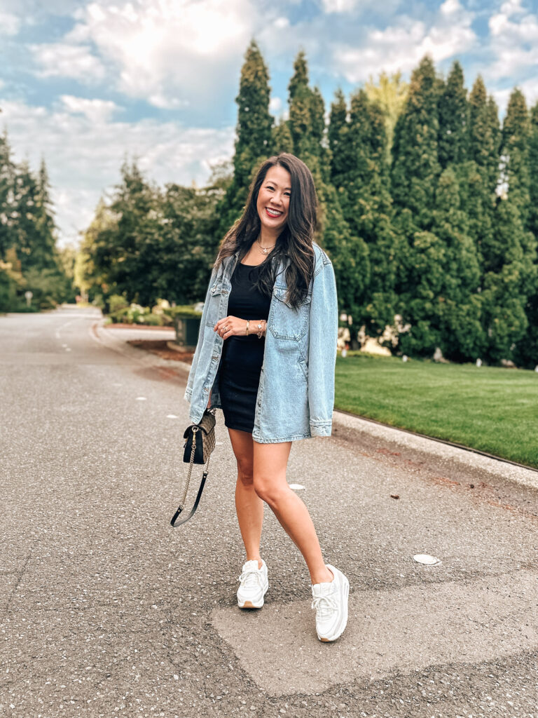 As someone on the short side (I’m 5’2″) I love a platform shoe and that includes sneakers! I added an oversized denim jacket over my favorite bodycon dress for an easy summer to fall transition look. If you want to wear this further into fall, look for a bodycon midi dress to cover more of your legs.