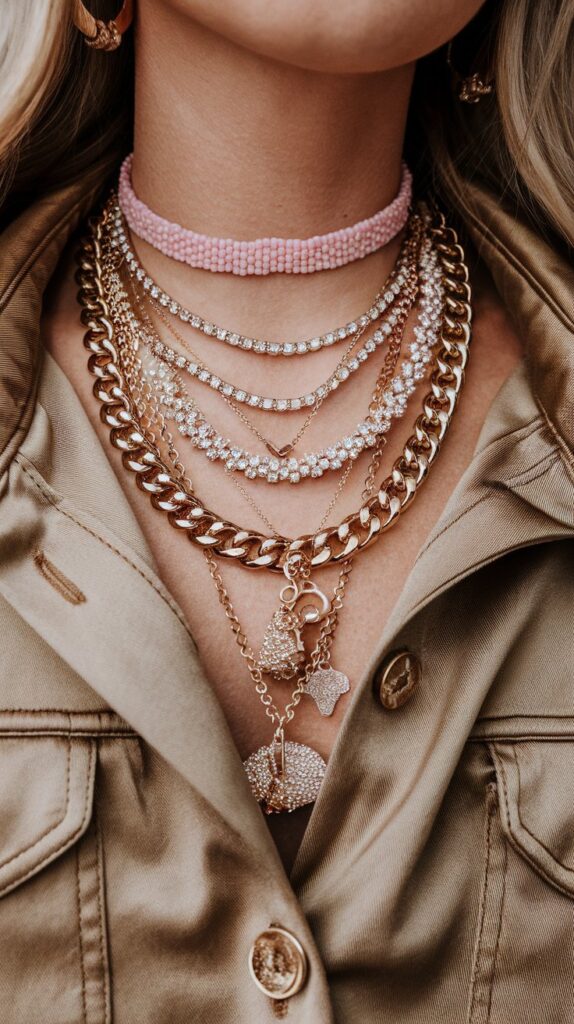 - Layered Necklace Look: Stack a variety of charm necklaces in different lengths. Pair them with a deep-V blouse and high-waisted trousers for a chic look. Add a pair of heeled boots to complete the outfit for an evening out or dinner date.