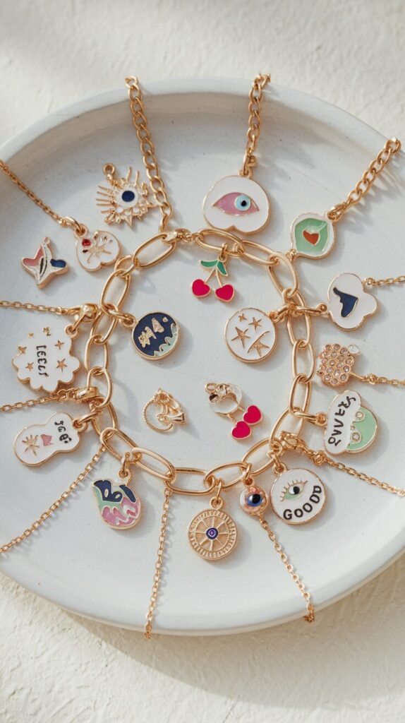 For a more boho vibe, consider charms with natural stones, feathers, or beads. Or, if you’re feeling adventurous, mix and match quirky charms like stars, hearts, and animals.